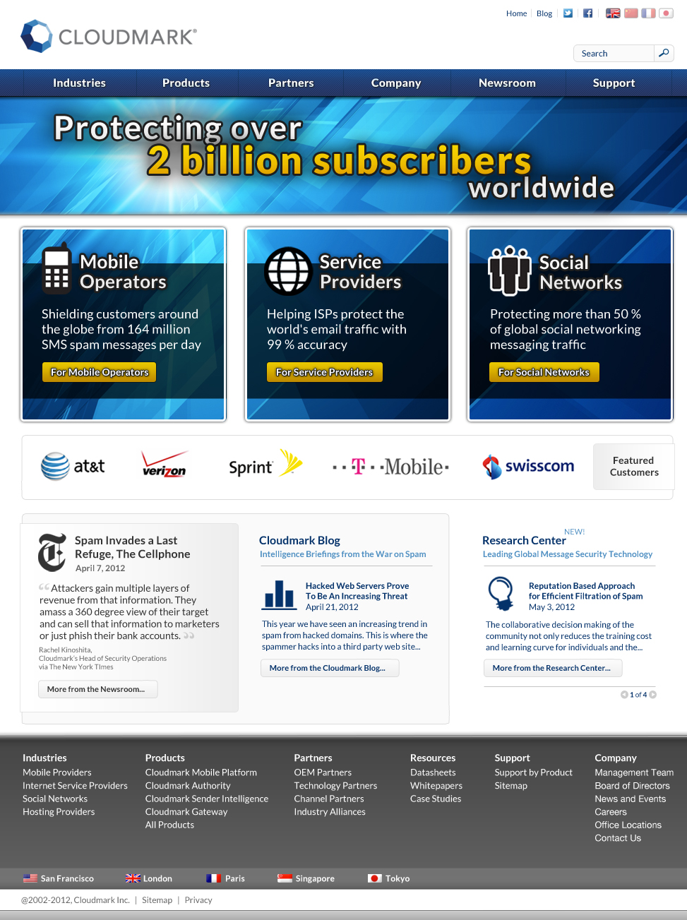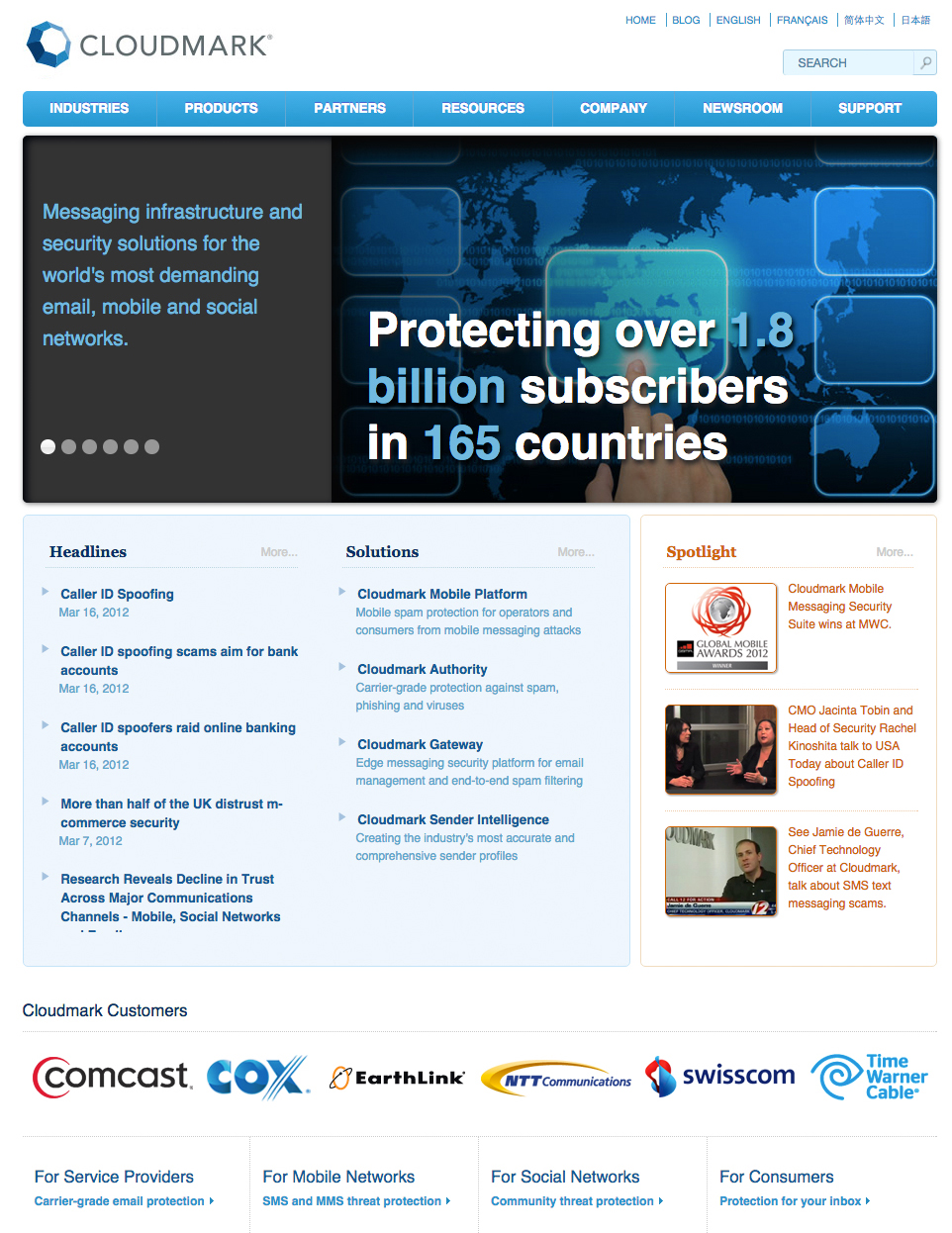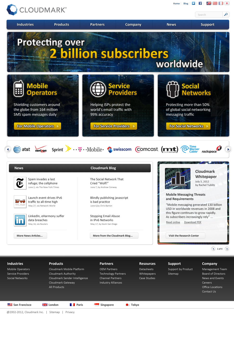 The site was redesigned in 2011 to improve usability and enhance Cloudmark's online presence in the messaging security space. The site was localized into four languages to support the expanding business. The site was designed to specifically target three groups of clients; mobile operators, service providers, and social networks.