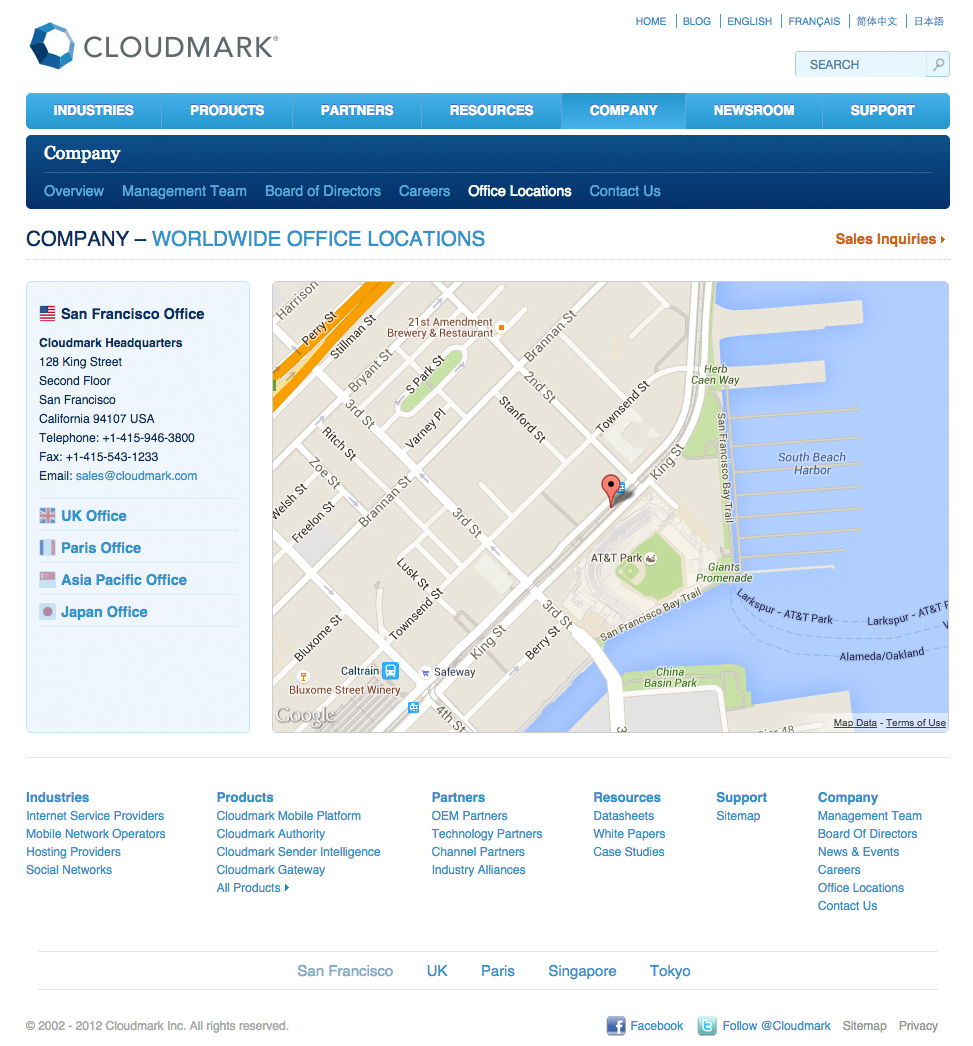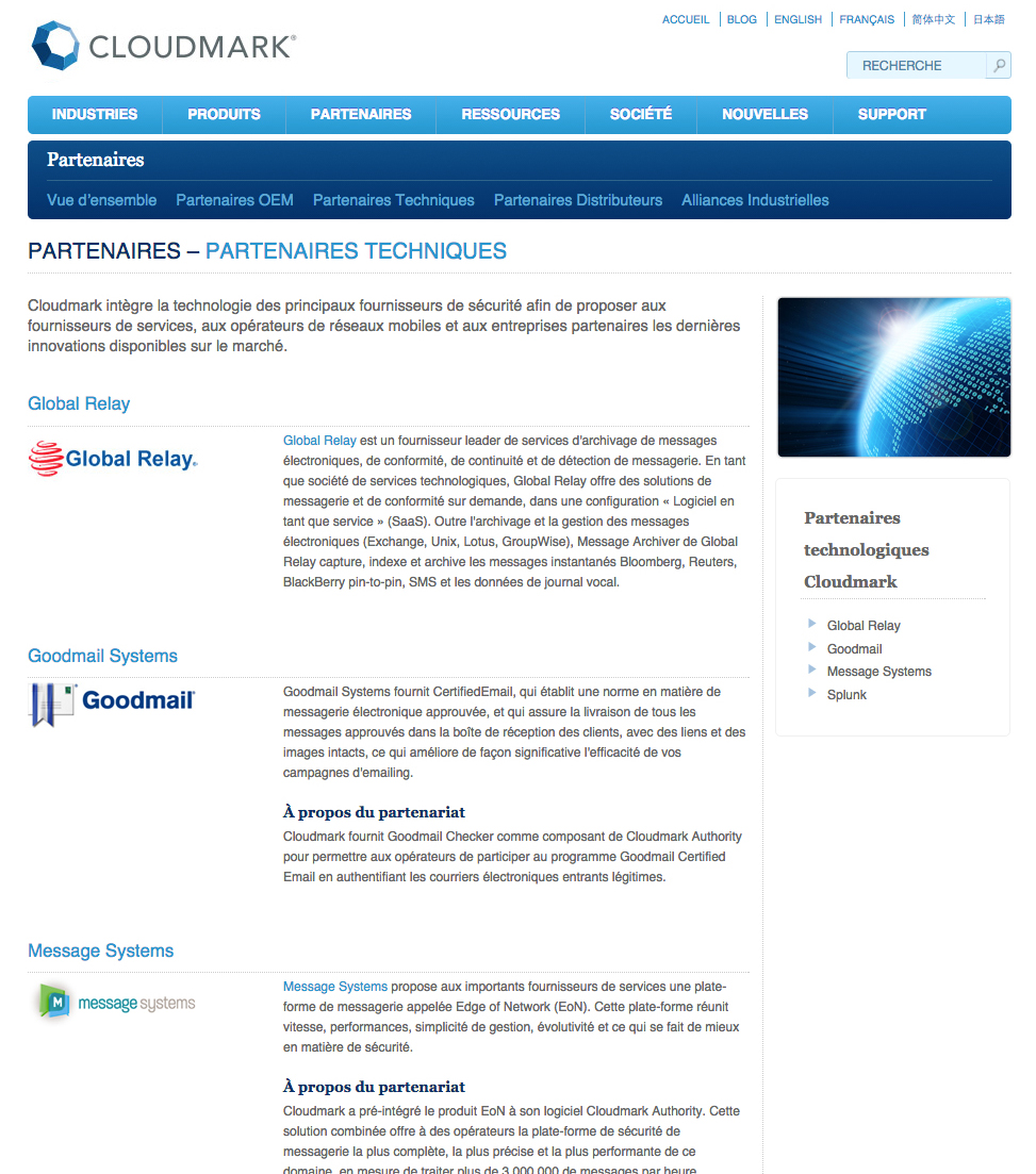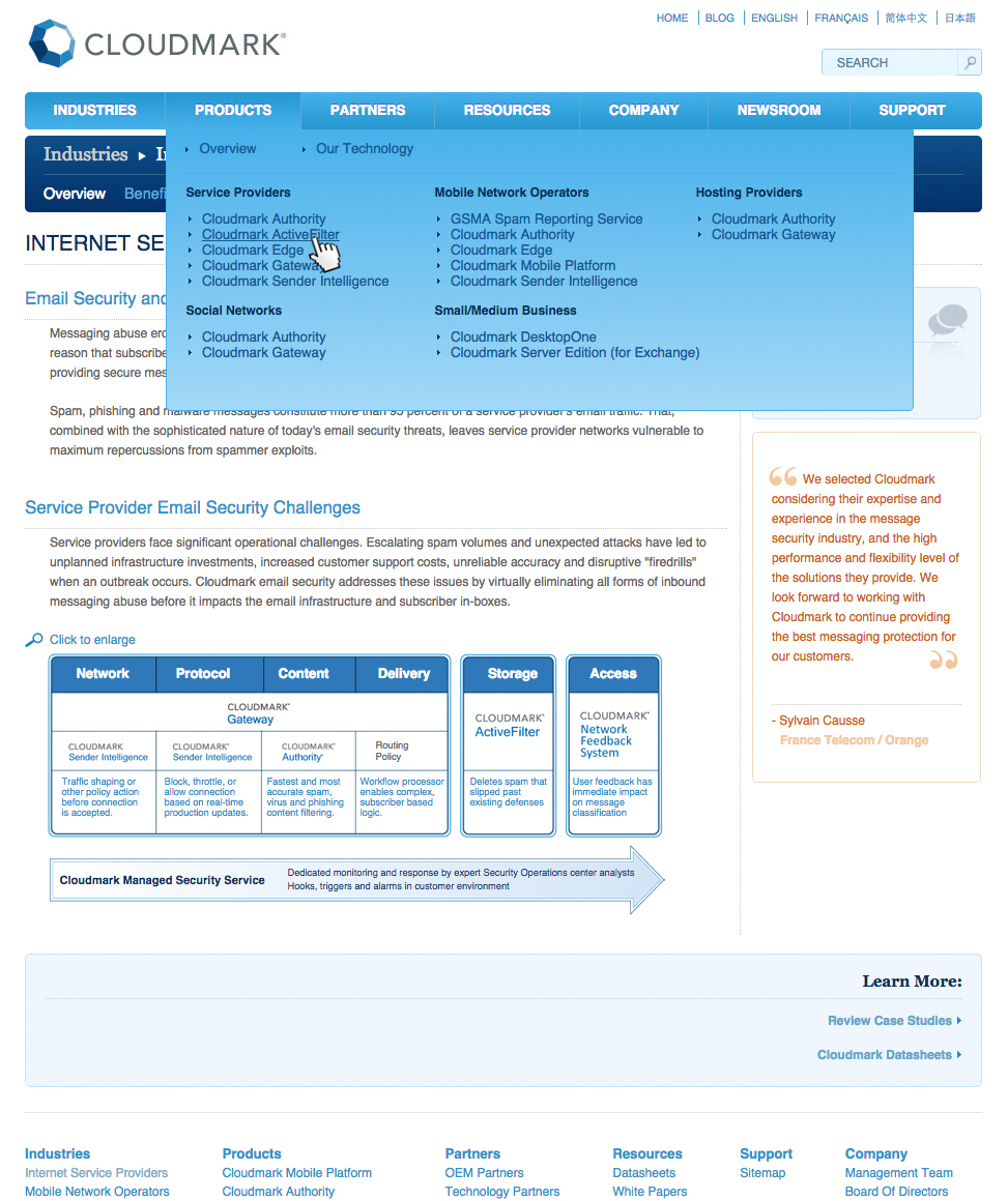 The site was redesigned in 2011 to improve usability and enhance Cloudmark's online presence in the messaging security space. The site was localized into four languages to support the expanding business. The site was designed to specifically target three groups of clients; mobile operators, service providers, and social networks.
