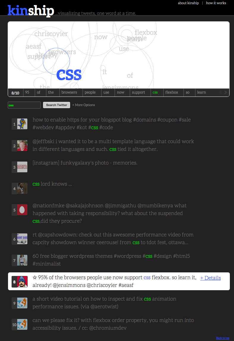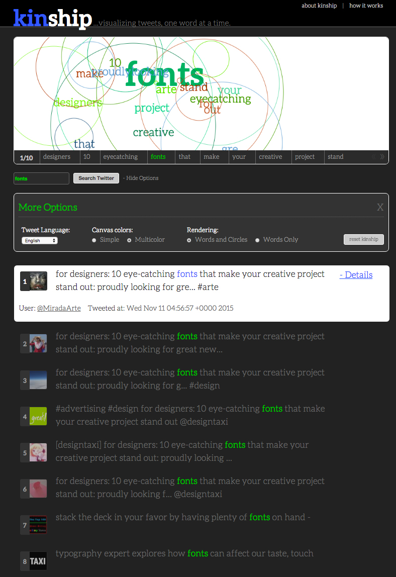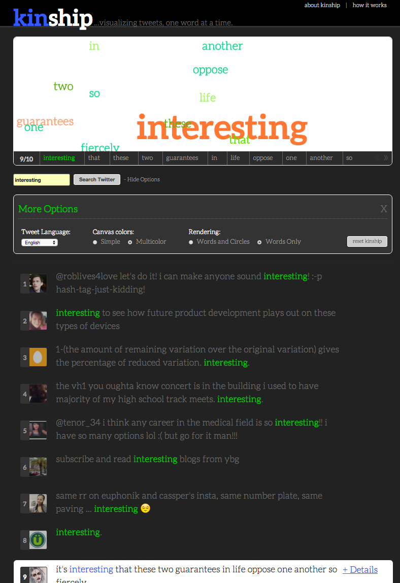 Kinship was created as an experiment for 10k apart, an contest to create something on the web in 10k or less. Kinship dynamically loads and then visualizes the relationships between words within a tweet. Kinship allows users to search for a word and then see how different tweets appear rendered within the html5 canvas tag. Your search term is highlighted and scaled according to the number of letters in contains. All other words are rendered randomly on the canvas.
