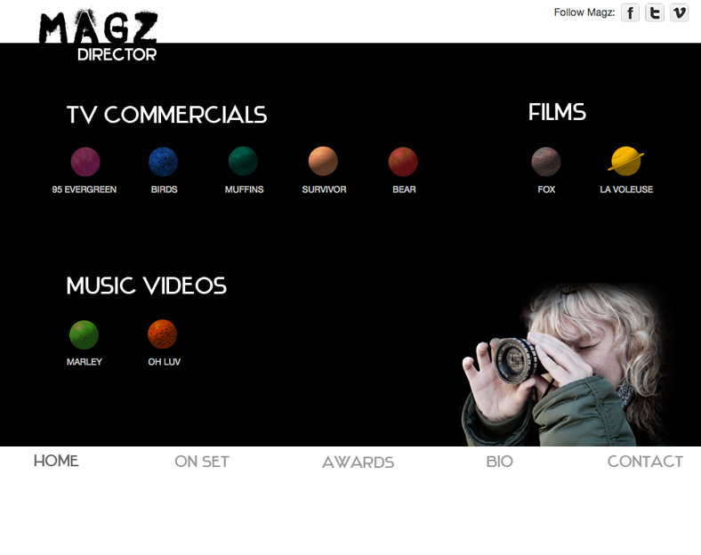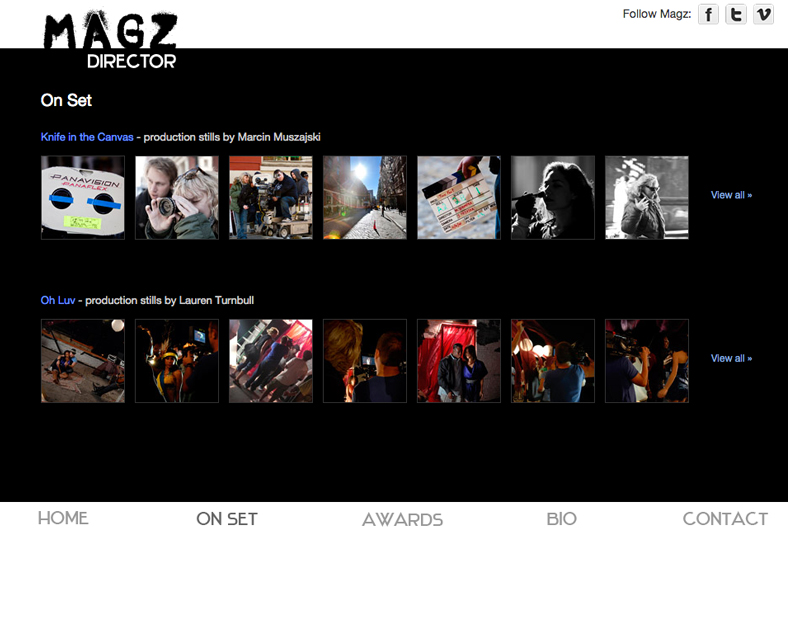 The portfolio website for Magda Sztompka, an award winning filmmaker based in New York City. The site highlights TV commercials, films and music videos, as well as showing several collections of photos from the director's sets.