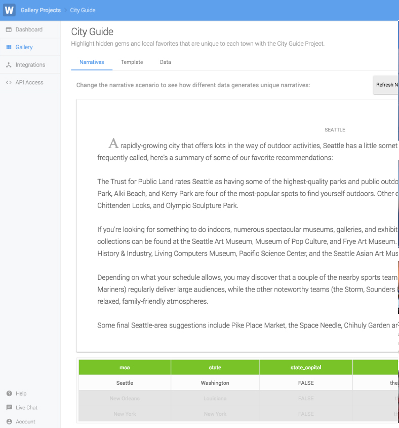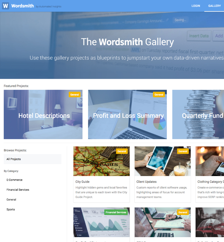 The Gallery was designed with 2 end goals in mind: first, as a marketing tool for Automated Insights to use to help showcase the power of the Wordsmith platform. Second, as a tool to help onboard existing users. The Gallery projects also act as definitive how-to resources for users to import into their accounts and play with.