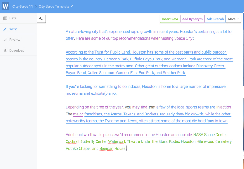 The Wordsmith Gallery is designed to house a collection of starter projects for Wordsmith customers. The projects can be copied from the Gallery to an account by a user, and then used as a tool to learn more about how to write automated content. The Gallery is also available for the general public as a window into the power of NLG, and the Wordsmith platform. The Gallery was written in Ruby and React. Master versions of each project are stored in S3 so that Gallery projects can be easily updated in one location and then synced to different environments.