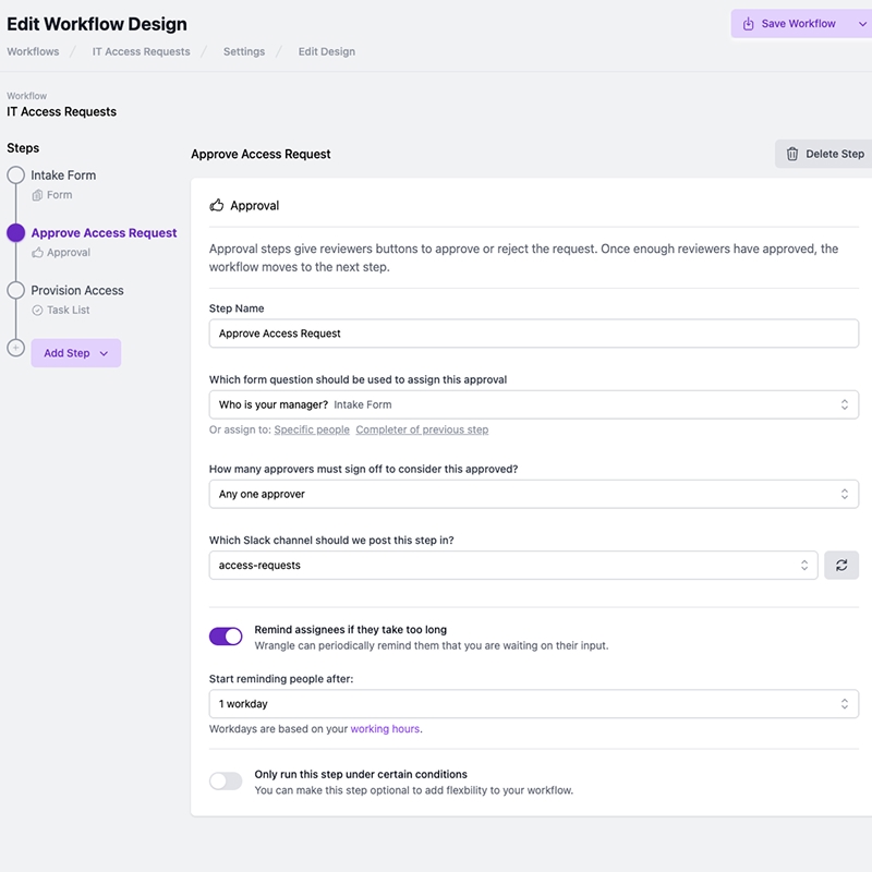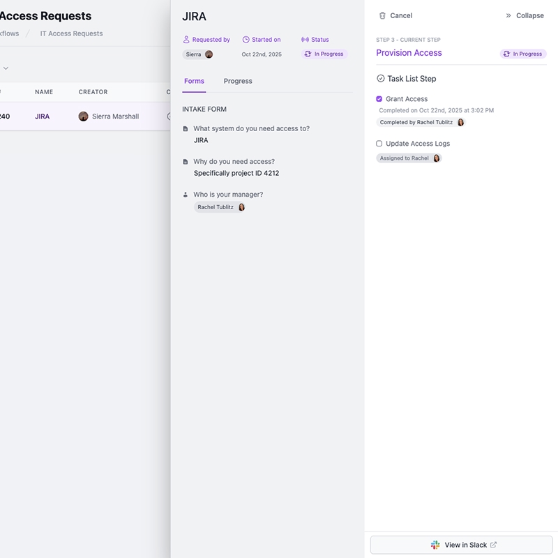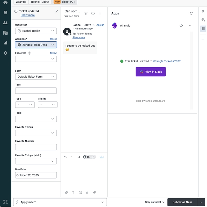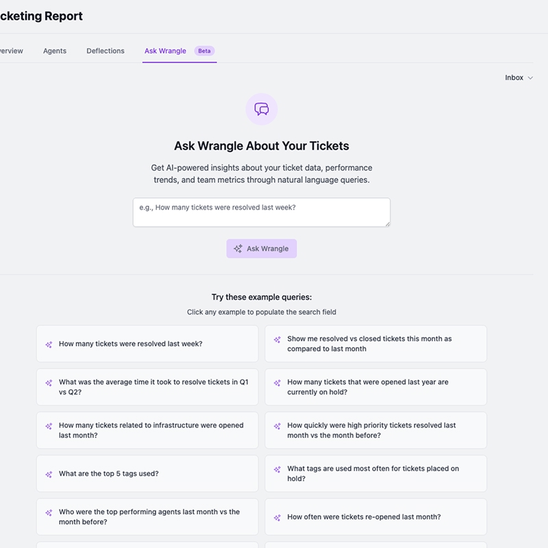 Core platform at Wrangle. Web based application integrated directly into Slack. Includes a public API, direct integrations to Zendesk, JSM, and Notion, and connects to many other platforms via Zapier.