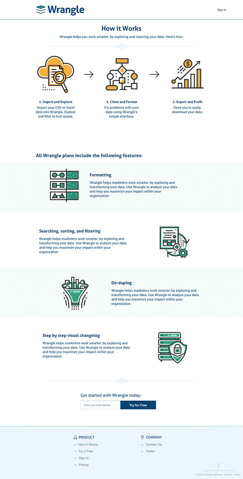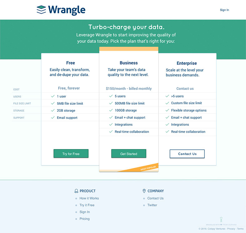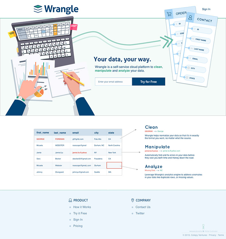 Marketing website for Wrangle Labs; a cloud based data platform. The website was built to showcase the unique capabilities of Wrangle Labs, and drive visitors towards signing up.